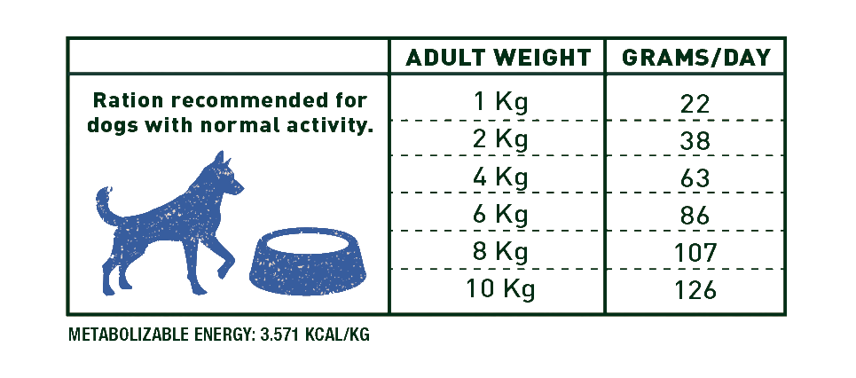 Componentes analíticos: Proteína bruta 27,00 %, Grasa bruta 13,00 %, Fibra bruta 6,00 %, Ceniza bruta 6,20 %, Calcio 1,00 %, Fósforo 0,85 %, Humedad 9,00 %, EPA+DHA 0,70 %, Glucosamina clorhidrato 820 mg/kg, Condroitín sulfato 520 mg/kg.