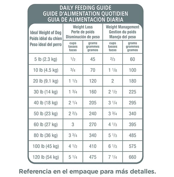 - Recomendado para: Perros adultos de 1 a 6 años de edad que requieren menos calorías (es decir, perros que son menos activos, castrados o propensos a aumentar de peso).