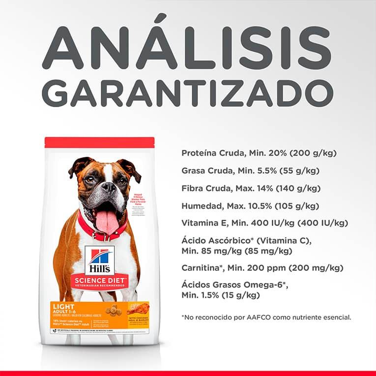 Hill's® Science Diet® Adult Light es una comida para perros adultos menos activos que requieren un alimento bajo en calorías para mantener un peso y estilo de vida sanos. Delicioso sabor pollo para aquellos que prefieren la variedad. Bajo en calorías y con L-carnitina que promueven un peso corporal ideal, favorecen una movilidad sana y mantienen la función cardiaca. Proteína de alta calidad y fibras naturales que ayudan a satisfacer el apetito entre comidas. Con Omega-6 y vitamina E para piel y pelaje hermosos.