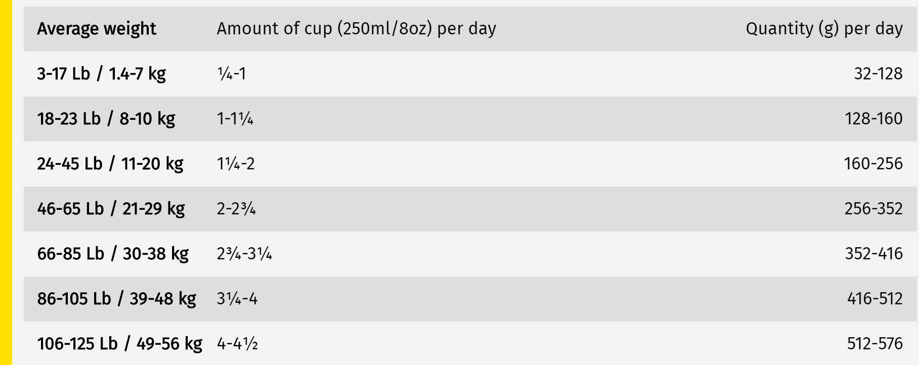 La energía metabolizable calculada es 3641 kcal/kg, 466 kcal / taza de 250 ml.